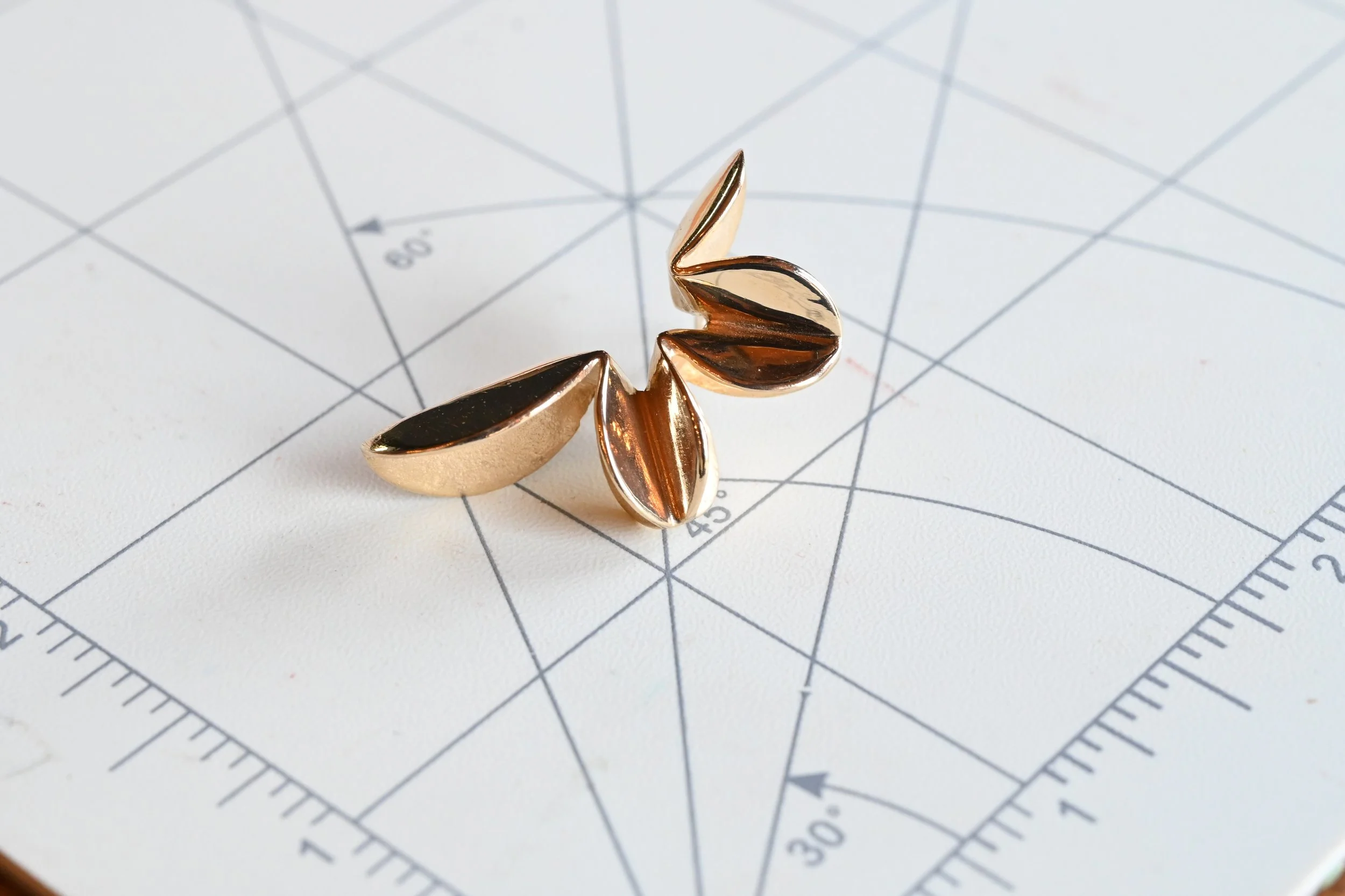 “Inspired by nature’s fractal patterns, these designs capture organic movement through folds, creases, and bends. Using the mathematical language of origami, each piece explores the elegance of transformation.”